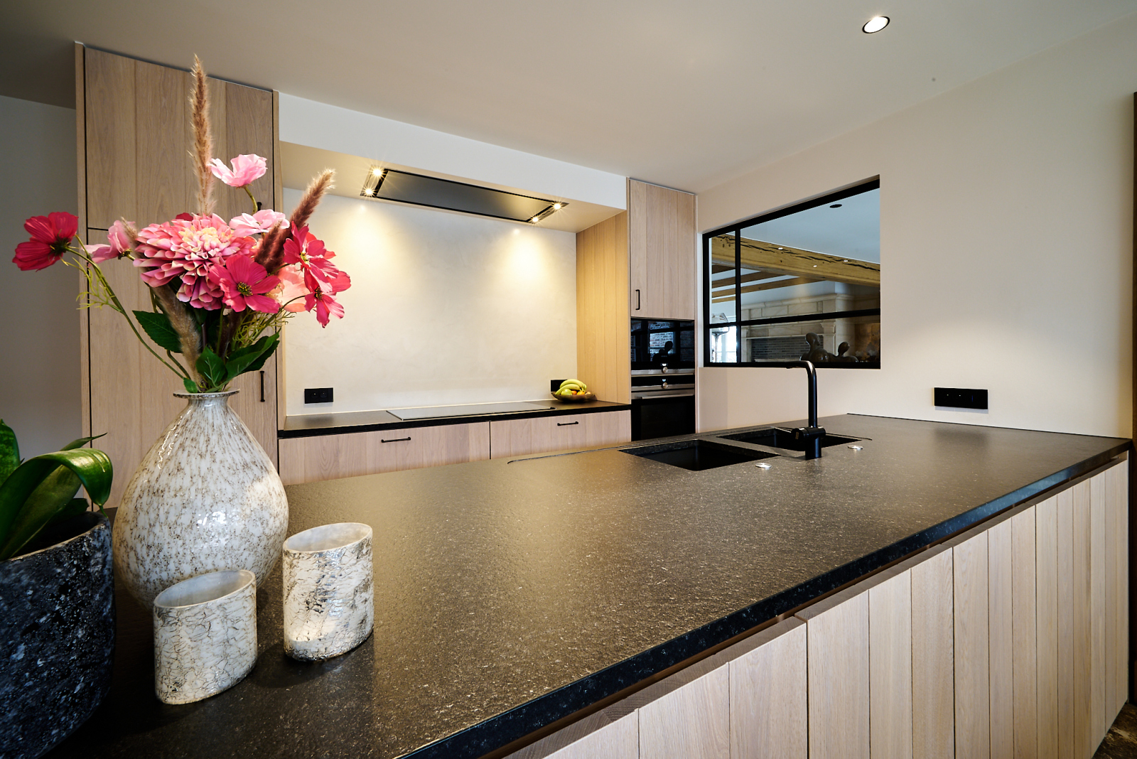 Deze open keuken met stevig composieten werkblad nodigt je uit om te genieten van heerlijke kookmomenten. Twee spoelbakken zorgen voor extra gemak tijdens de afwas, terwijl de naadloos verwerkte stopcontacten het werken in de keuken eenvoudig maken. Extra kastruimte onder het kookeiland maakt deze keuken niet alleen stijlvol, maar ook praktisch. Een echte blikvanger is de vitrinekast met indirecte verlichting, perfect om jouw mooiste glazen in de spotlight te zetten.